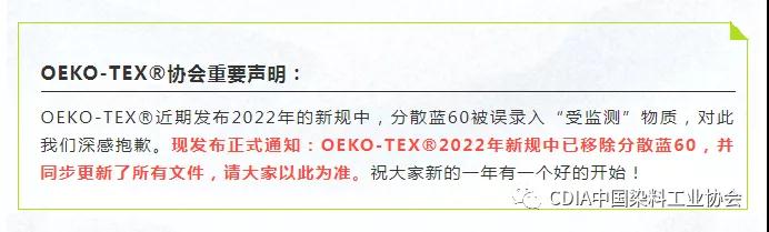 今天,OEKO-TEX協會發布重要聲明:OEKO-TEX2022年新規中已移除分散藍60,并更新了所有文件。